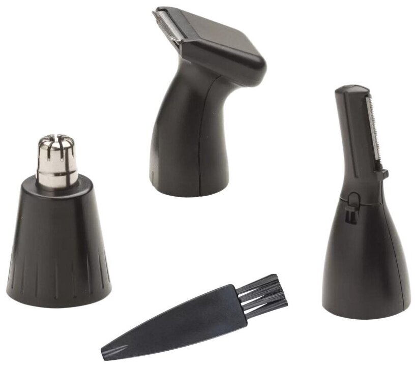 Included: Vertical eyebrow trimmer. Rotatable nozzle/head for nose and ears. Attachment for beard/neck trimming.