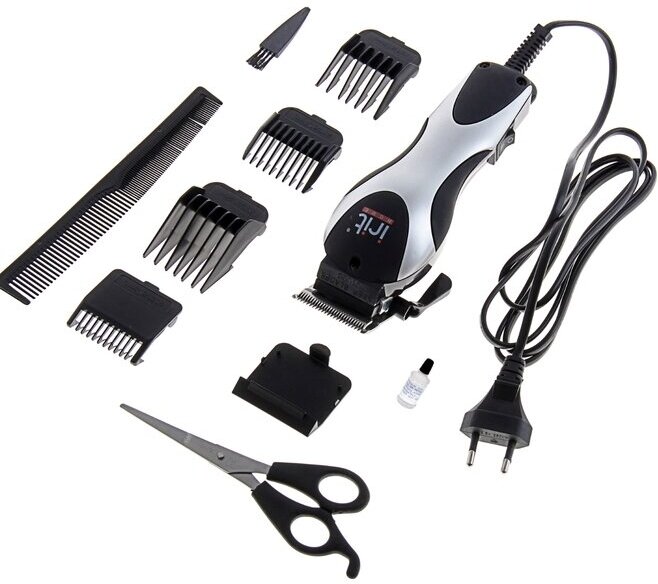 Purpose: for hair cutting, type: hair clipper, power supply: mains, length adjustment method: changing attachments, included: scissors, number of attachments: 4