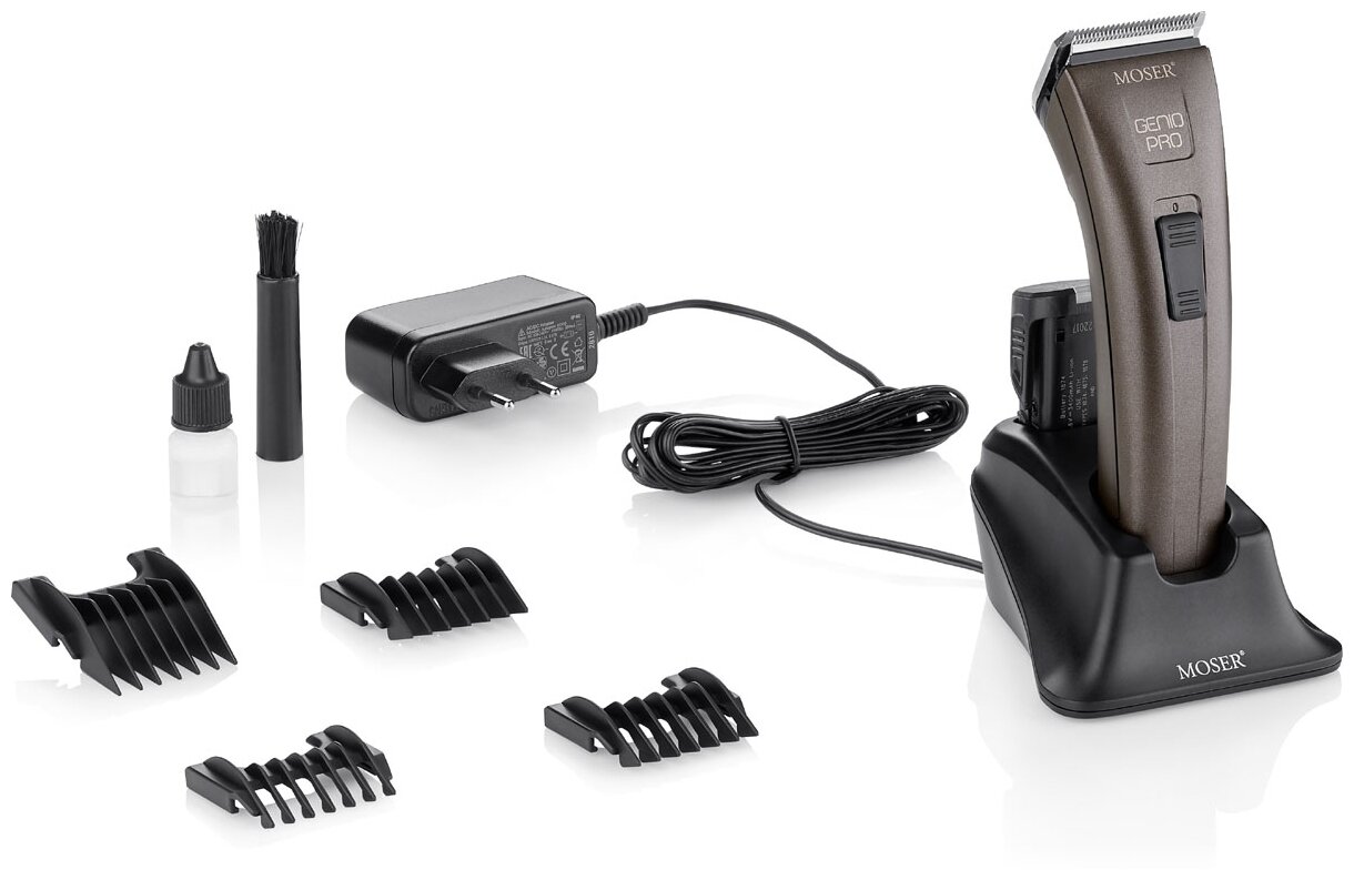 Equipment - hair clipper, 2 battery packs, mains adapter, charging base, attachments 3, 6, 9 and 12 mm, cleaning brush, oil, metal case