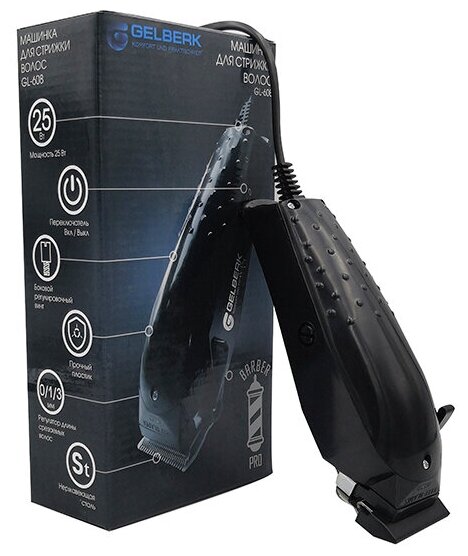 Power 25 W Includes: 4 attachments for setting hair length from 3 to 12 mm, comb, scissors, lubricant, cleaning brush