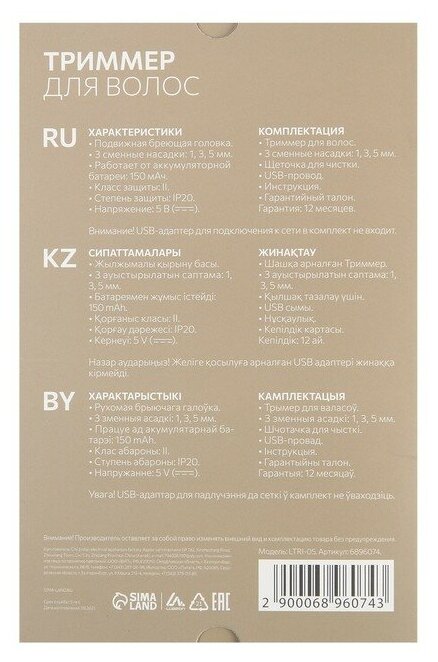 Purpose: for beard and mustache, for cutting hair, type: trimmer, power supply: autonomous, minimum cutting length: 1 mm, maximum cutting length: 5 mm, length adjustment method: changing attachments, number of attachments: 3