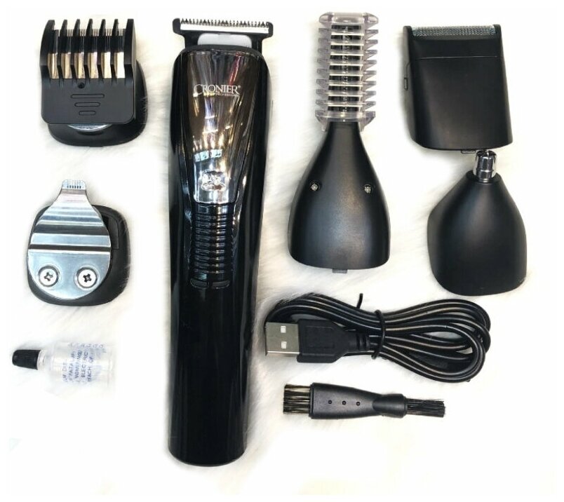Contents: machine, 5 comb attachments, narrow trimmer, nose trimmer, designer trimmer, hair trimmer, shaving head, base, USB cable, cleaning brush, oil