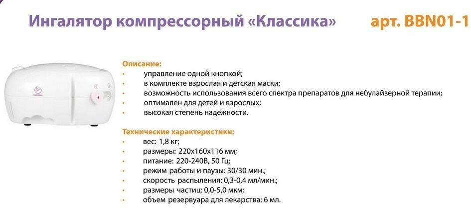 Compressor inhaler nebulizer, power supply: mains, nebulization: 0.40 ml/min, medicine capacity: 6 ml, continuous operation time: 30 min
