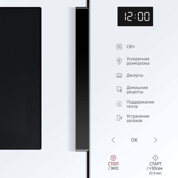 Child lock, display, +30 seconds button, mute, camera light, microwave even distribution system, With turntable, Clock