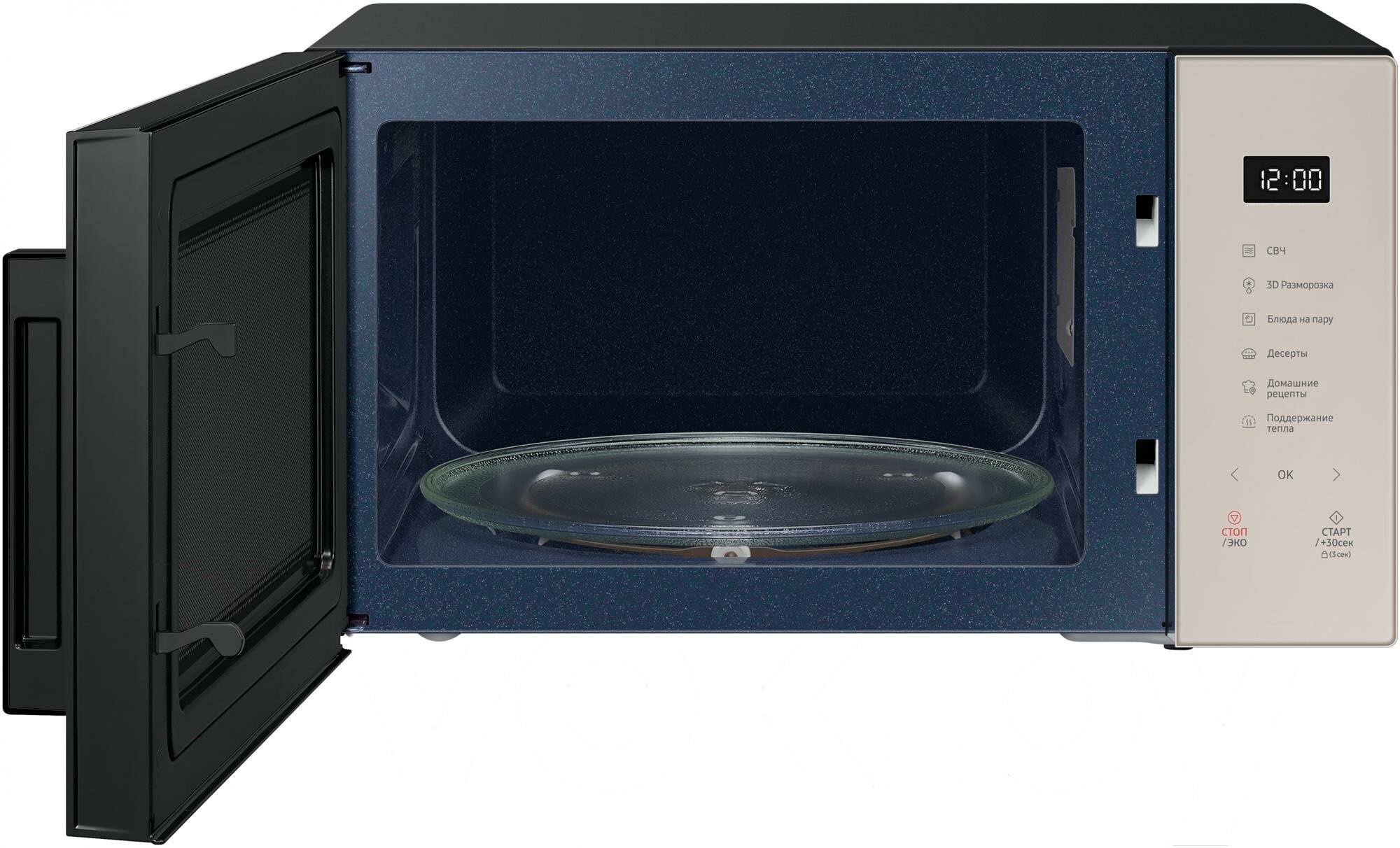 Child lock, display, +30 seconds button, mute sound, camera backlight, even microwave distribution system