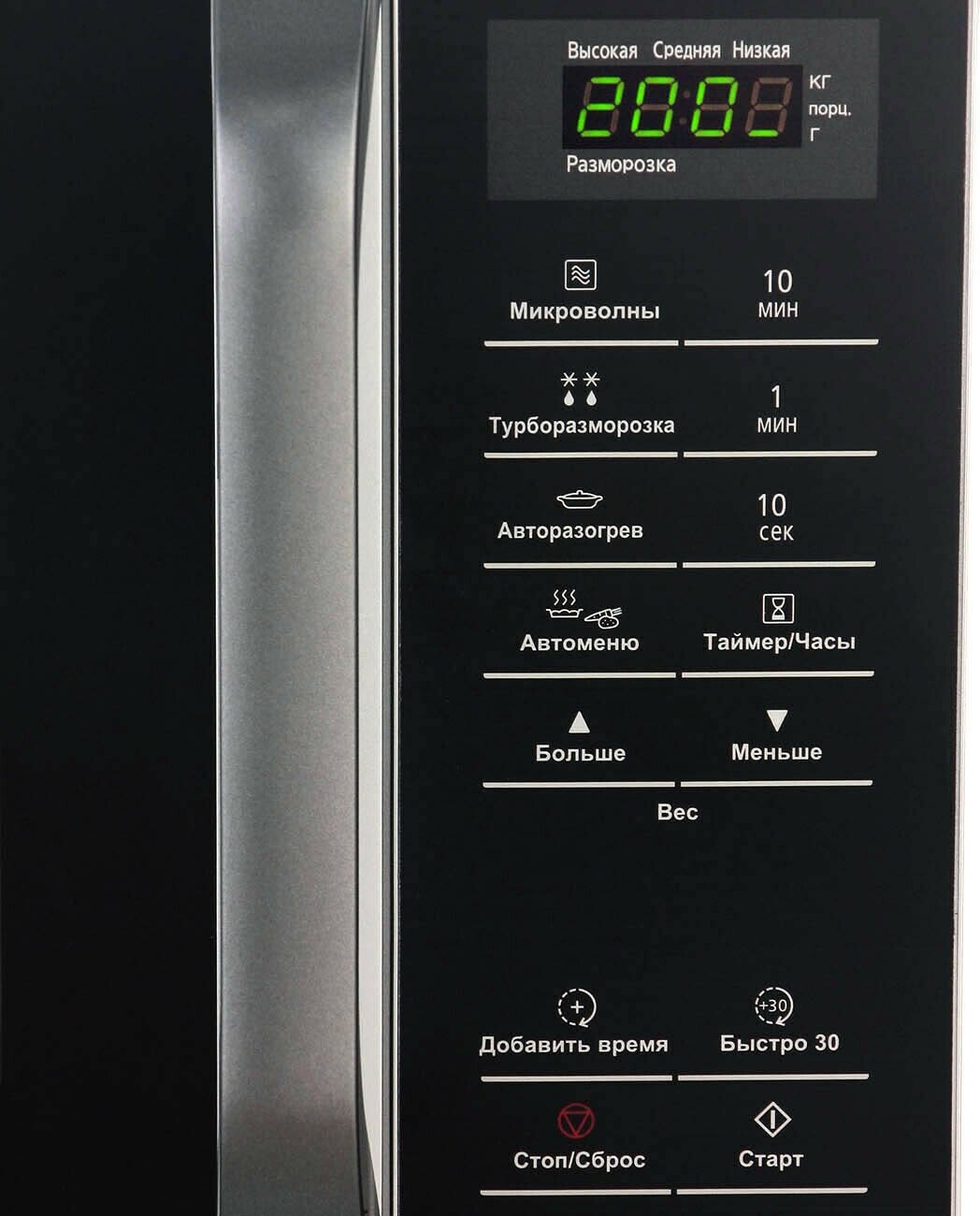Location: free-standing, volume: 20 l, switches: touch, microwave power: 800 W, inner chamber coating: enamel, width: 44.30 cm, depth: 33 cm, height: 25.80 cm, operating modes: Solo, additional modes: auto