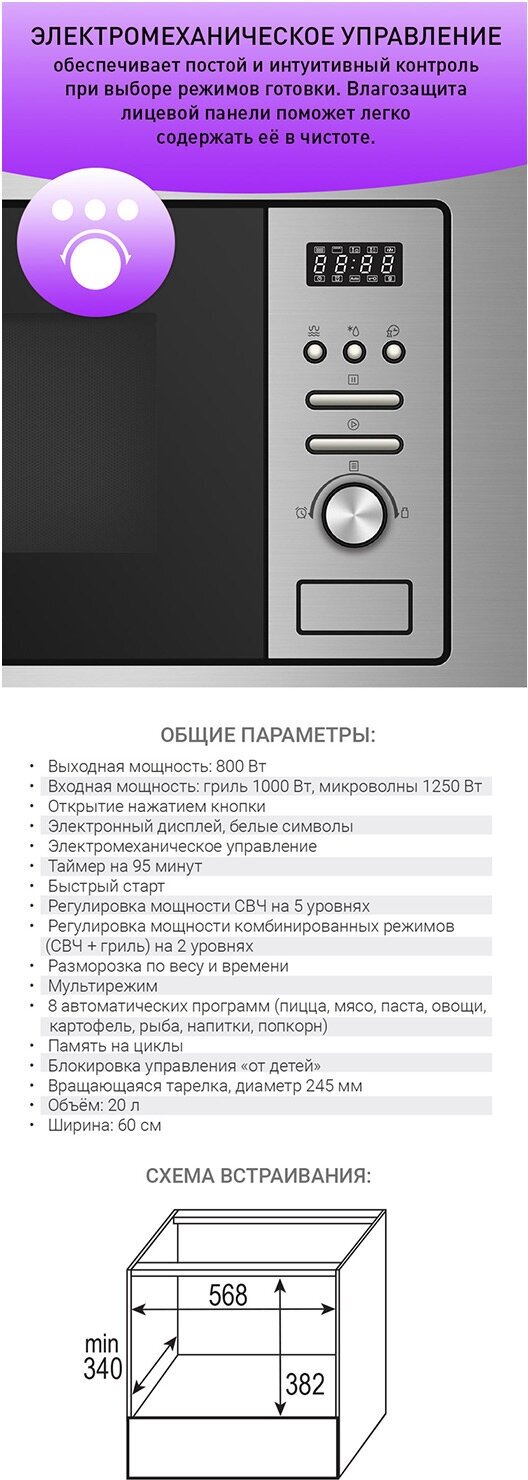 Location: built-in, volume: 20 l, switches: push-button, rotary clock, microwave power: 1250 W, inner chamber coating: stainless steel. steel, width: 56.80 cm, depth: 34 cm, height: 38.20 cm, operating modes: grill, mi