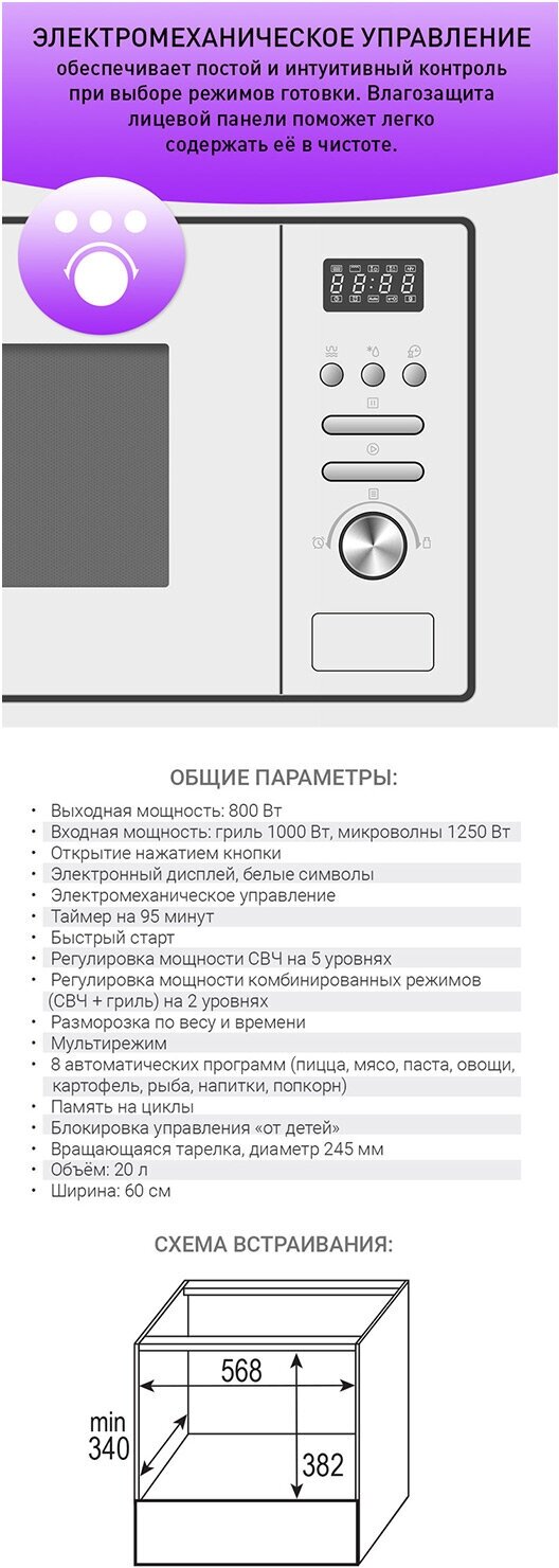 Location: built-in, volume: 20 l, switches: push-button, rotary mechanical, microwave power: 800 W, width: 56.80 cm, depth: 34 cm, height: 38.20 cm, operating modes: grill, defrost, additional modes: sound