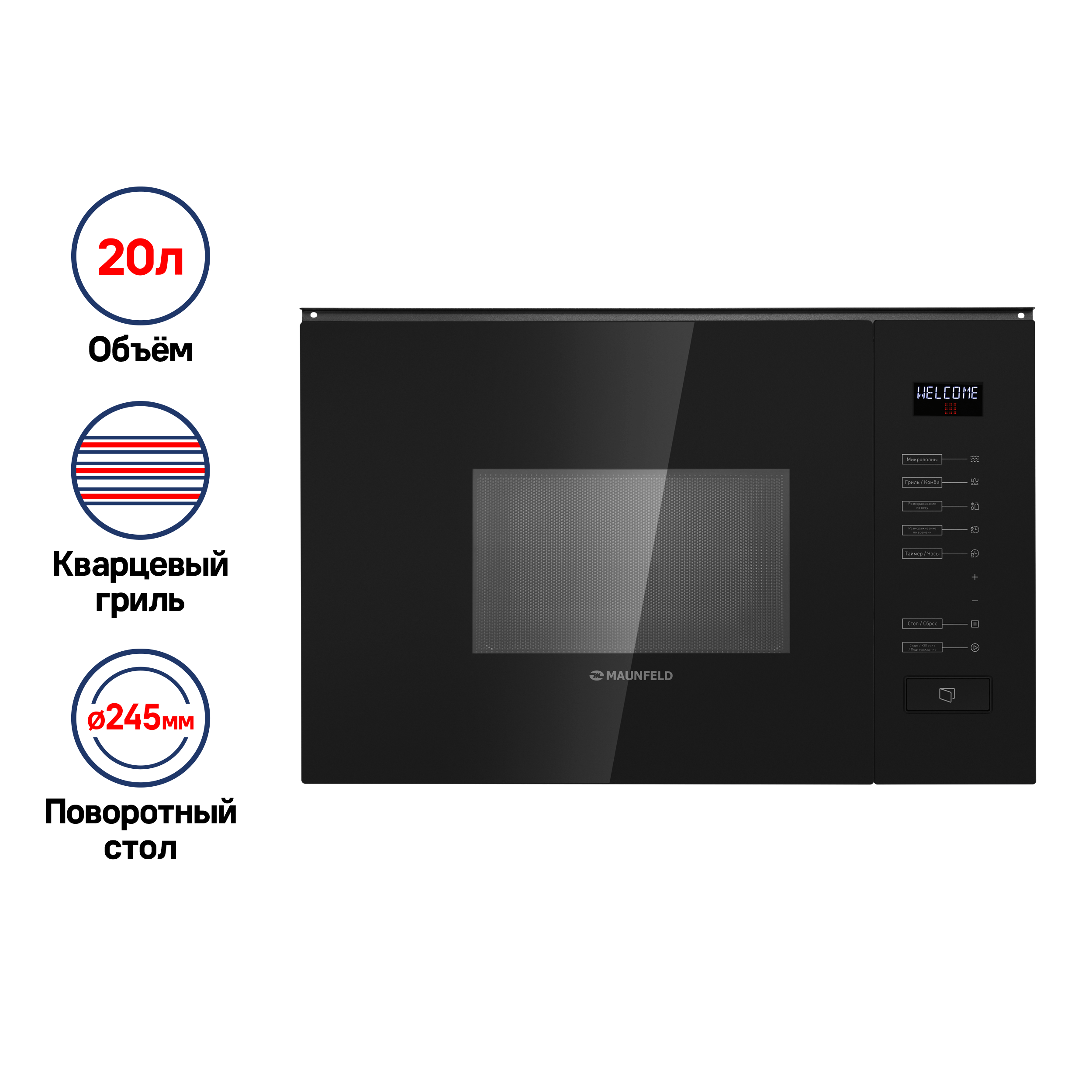 Location: built-in, volume: 20 l, switches: touch, microwave power: 800 W, inner chamber coating: stainless steel. steel, width: 59.50 cm, depth: 31.20 cm, height: 38.20 cm, operating modes: grill, microwave + grill, times