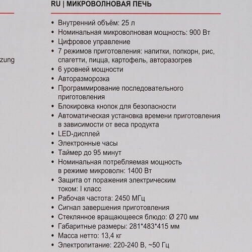 Location: free-standing, volume: 25 l, switches: push-button, rotary tact, microwave power: 900 W, width: 48.30 cm, depth: 41.50 cm, height: 28.10 cm, operating modes: defrost, additional modes: automatic