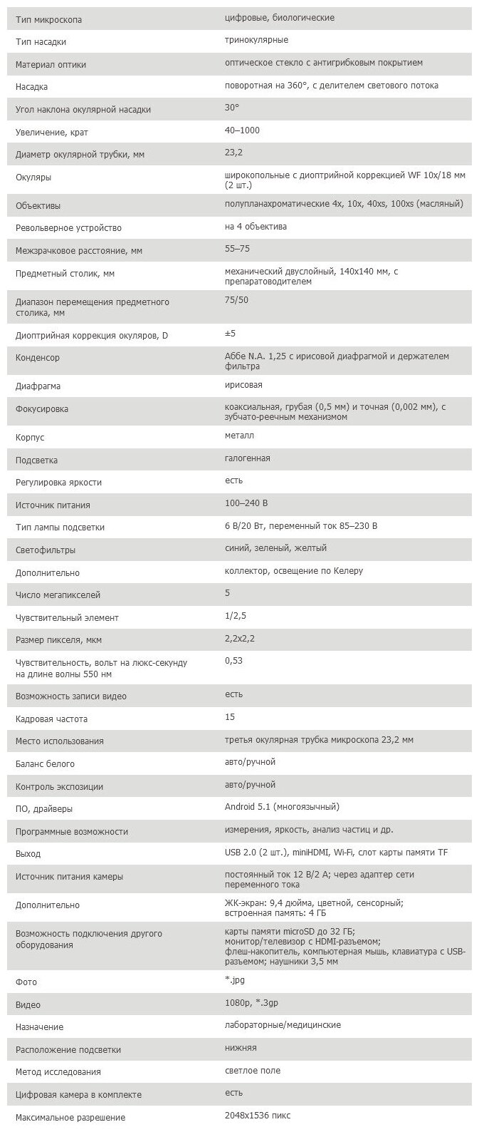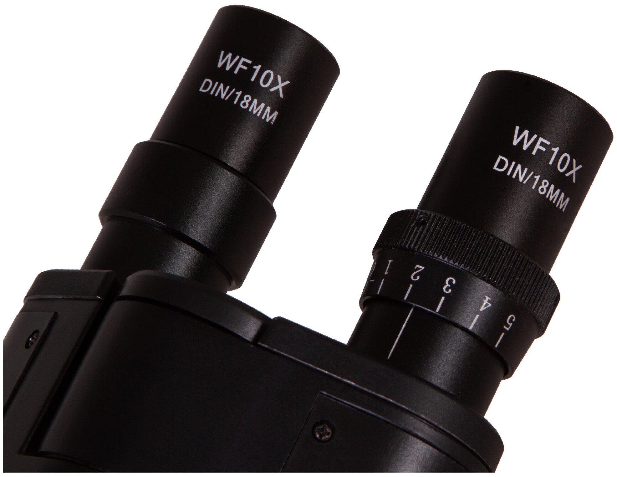 Microscope stand with base; trinocular 360° rotatable head; semi-planachromatic lenses: 4x, 10x, 40xs, 100xs oil-based with anti-fungal coating; wide-field eyepieces: WF10x/18 mm with anti-fungal coating 2