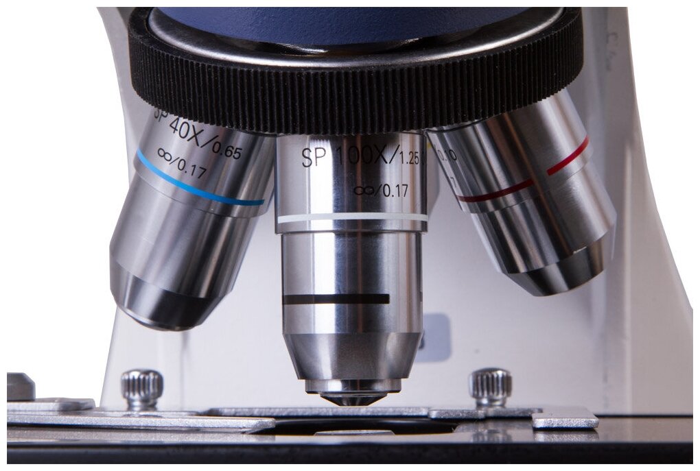 Semi-planachromatic, infinity corrected: 4x, 10x, 40xs, 100xs oil