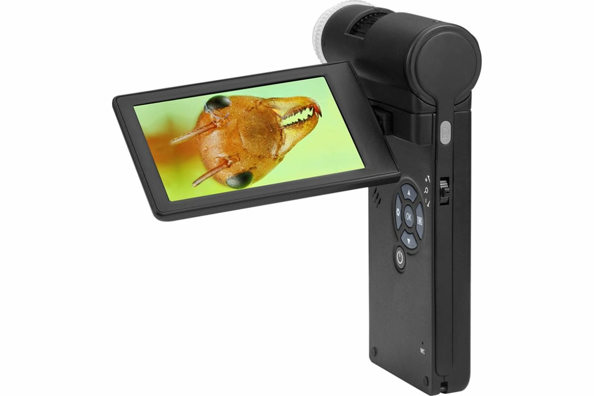 10.1 cm 4 color LCD display; magnification with digital zoom: 10–1200; manual focusing from 0 mm to 100 mm; battery life: 2.5 hours, charging time: 4 hours; tripod included adjustable height 0.5–3 cm