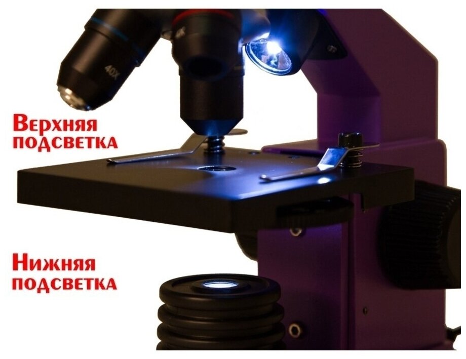 Microscope; Lenses: 4x, 10x and 40xs; Eyepiece: WF16x; Subject table with clamps; Diaphragm disk; Condenser; Built-in lower and upper LED lights; Power adapter 220 V, 50 Hz; Levenhuk K5 Experiment Kit
