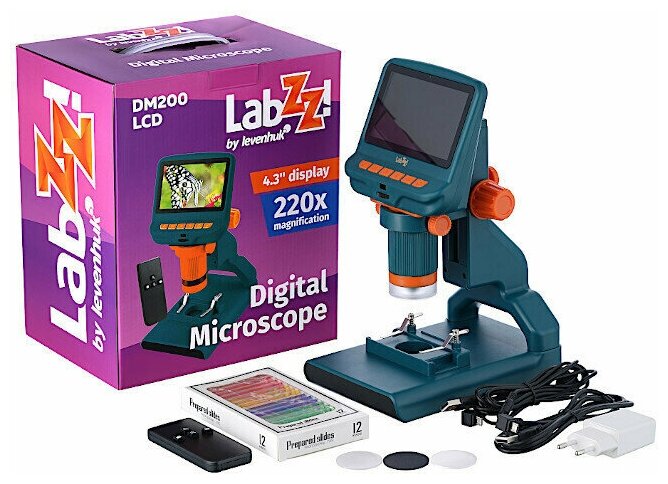 Microscope with LCD screen - Stage with clamps and slides - Infrared remote control - Ready-made microslides - Locust wing - Honeybee wing - Honeybee leg - M