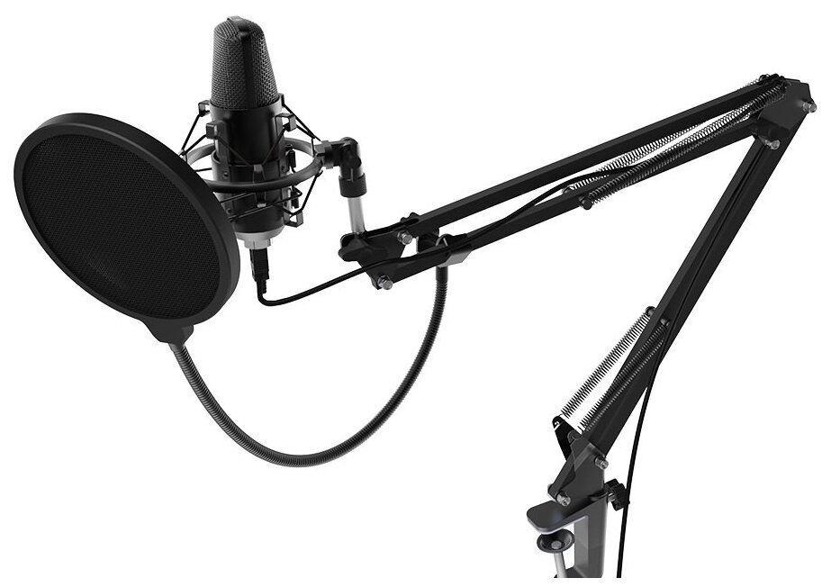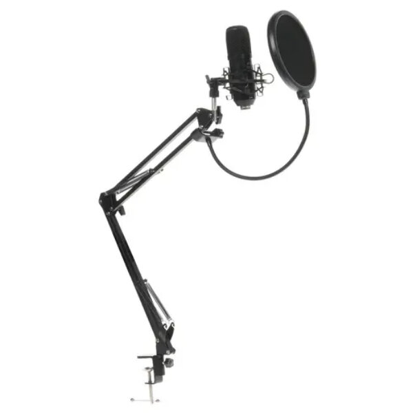 Condenser microphone, pantograph stand, pop filter, cable components, instructions, original packaging