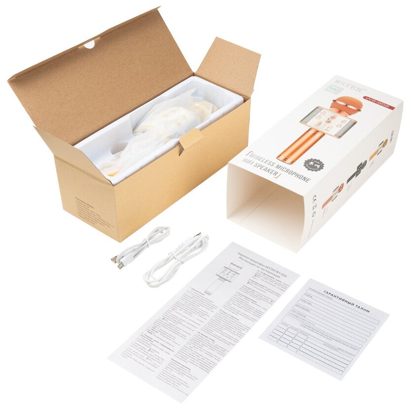 Microphone, USB/microUSB cable, AUX 3.5mm audio cable, instructions in Russian, warranty card