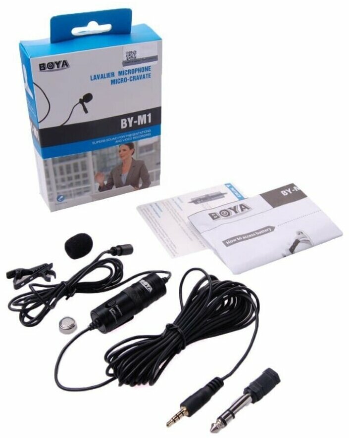 Detailed equipment: BY-M1 microphone, clothing clip, LR44 battery, foam windscreen, 1/4″ adapter, case, documentation, box