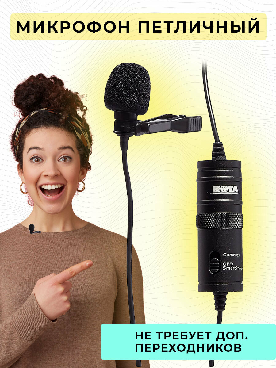 BY-M1 microphone, clothing clip, LR44 battery, foam windscreen, 1/4″ adapter, case, documentation, box