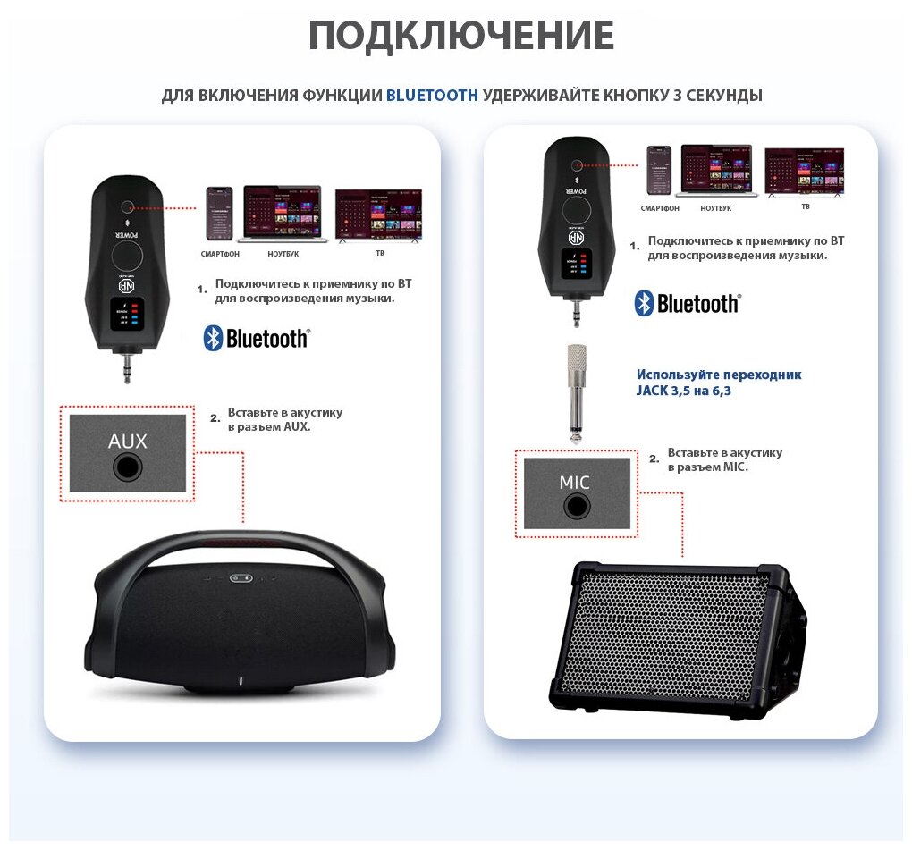Any audio equipment with AUX audio input and microphone input, signal reception via Bluetooth