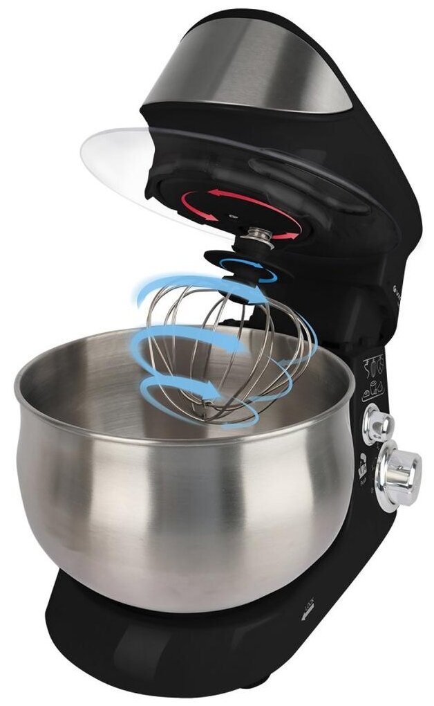 Type: planetary stationary, power: 1100 W, attachments: whisk for whipping, hooks for kneading dough, bowl material: stainless steel, bowl volume: 5 l, body material: plastic, additional modes: pulse �