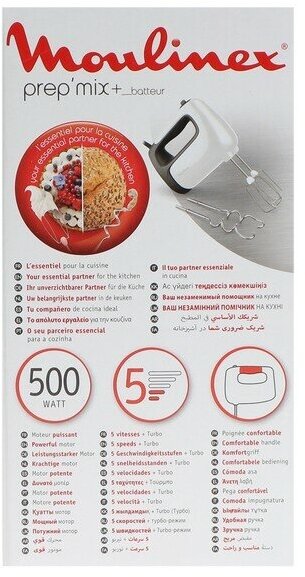 Type: manual, power: 500 W, attachments: whisk for whipping, hooks for kneading dough, whisk - 2 pcs, hook - 2 pcs, body material: plastic, additional modes: turbo mode, design features: release button