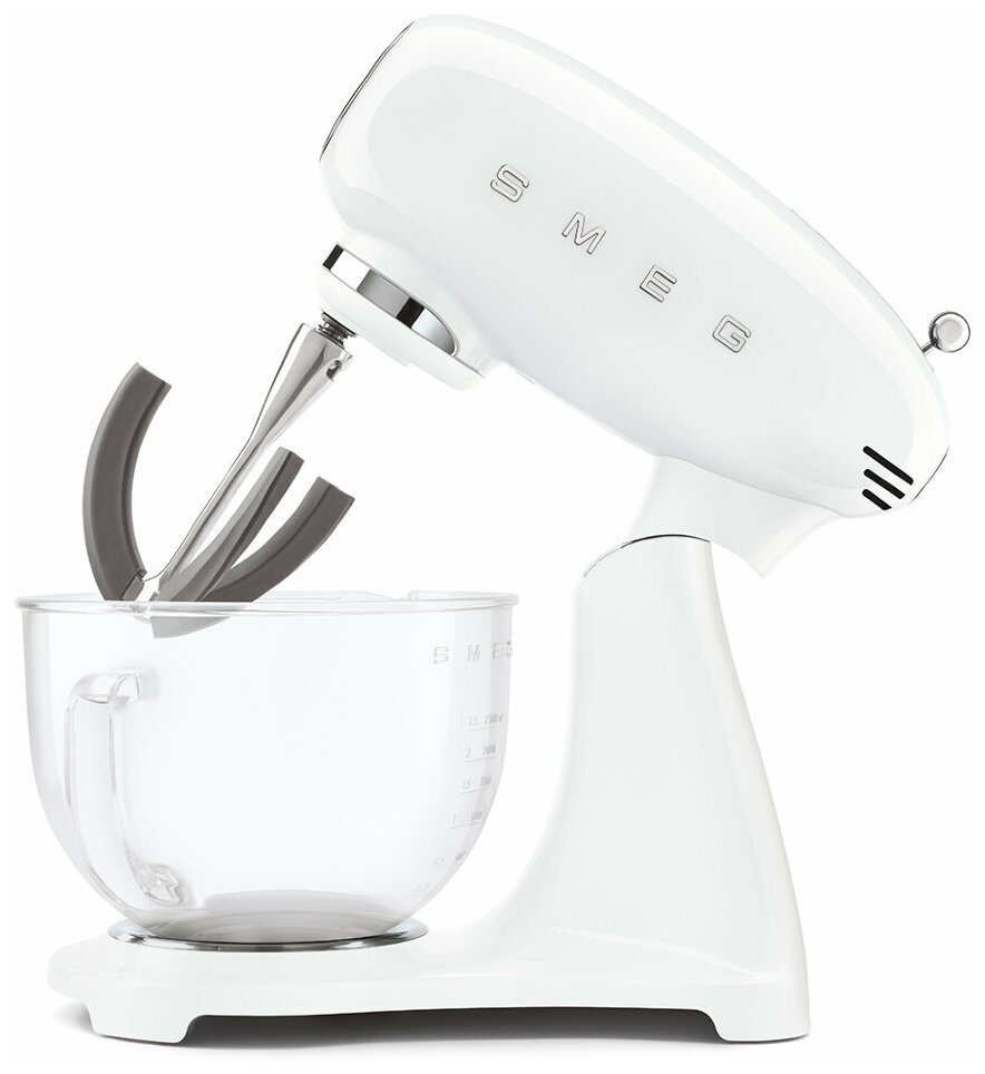 Type: stationary, power: 800 W, attachments: whisk for whipping, hooks for kneading dough, bowl material: glass, bowl volume: 4.80 l, body material: metal, design features: protective cover on the bowl, number of speed