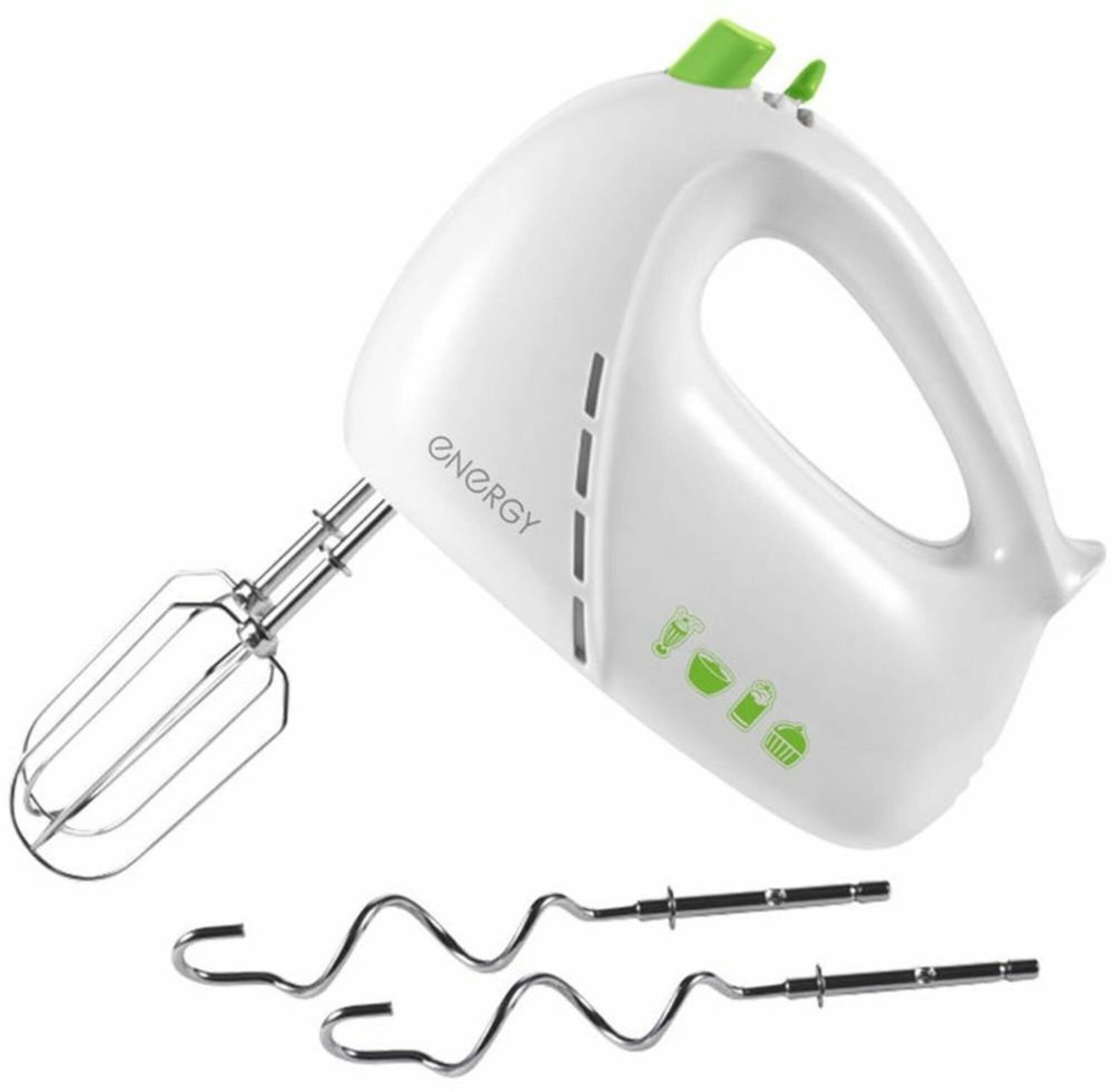 Type: manual, power: 200 W, attachments: whisk, hooks for kneading dough, body material: plastic, design features: attachment release button, number of speeds: 5