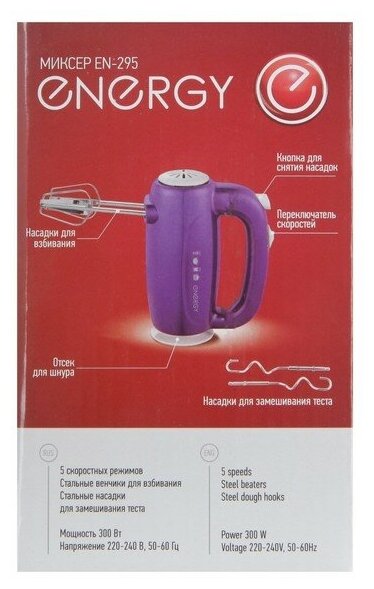 Type: manual, power: 300 W, attachments: whisk, hooks for kneading dough, body material: plastic, design features: attachment release button, number of speeds: 5