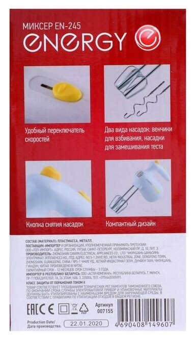 ENERGY EN-245, manual, 200 W, 5 speeds, 2 nozzles, white/yellow 5365208
