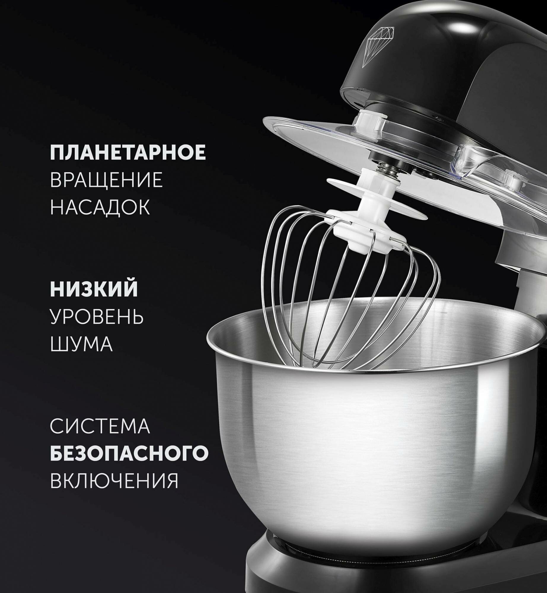 Type: planetary stationary, power: 1100 W, attachments: whisk for whipping, hooks for kneading dough, bowl material: stainless steel, bowl volume: 5 l, body material: plastic, additional modes: pulse �