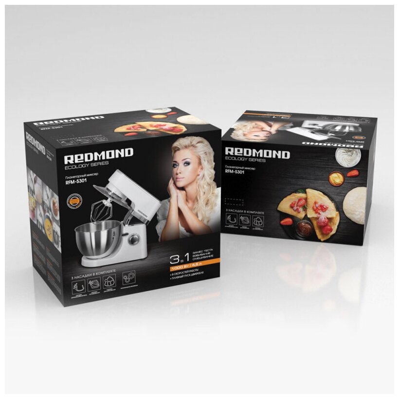 Type: planetary stationary, power: 1000 W, attachments: whisk for whipping, hooks for kneading dough, mixer attachment, bowl material: stainless steel, bowl volume: 4.50 l, body material: plastic, features const.