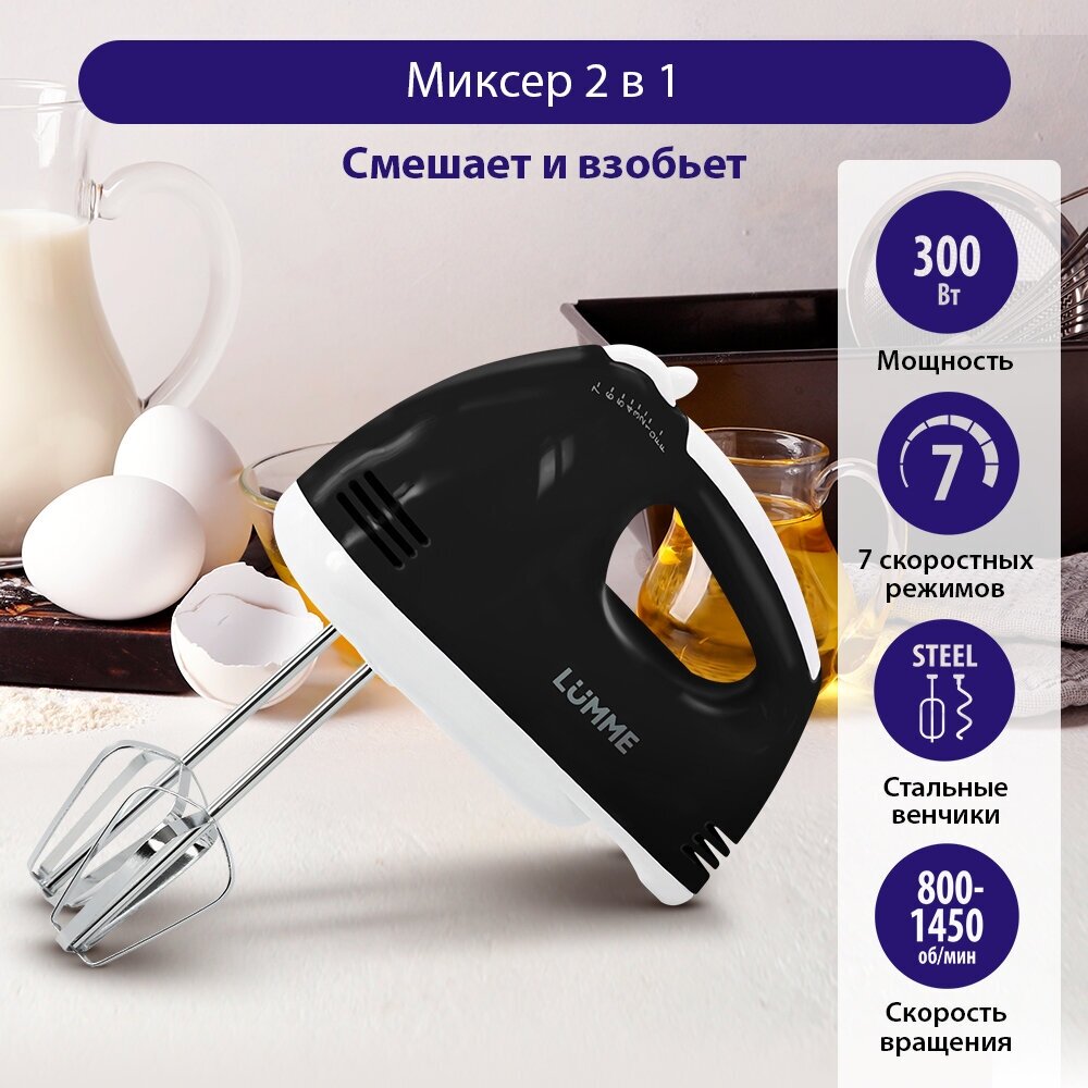 Type: manual, power: 300 W, attachments: whisk for whipping, hooks for kneading dough, body material: plastic, design features: attachment release button, number of speeds: 7, power cord length: 1.05 m