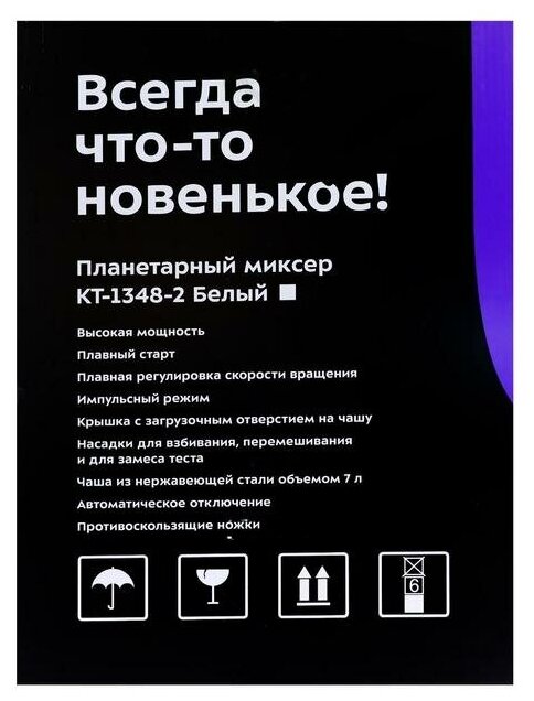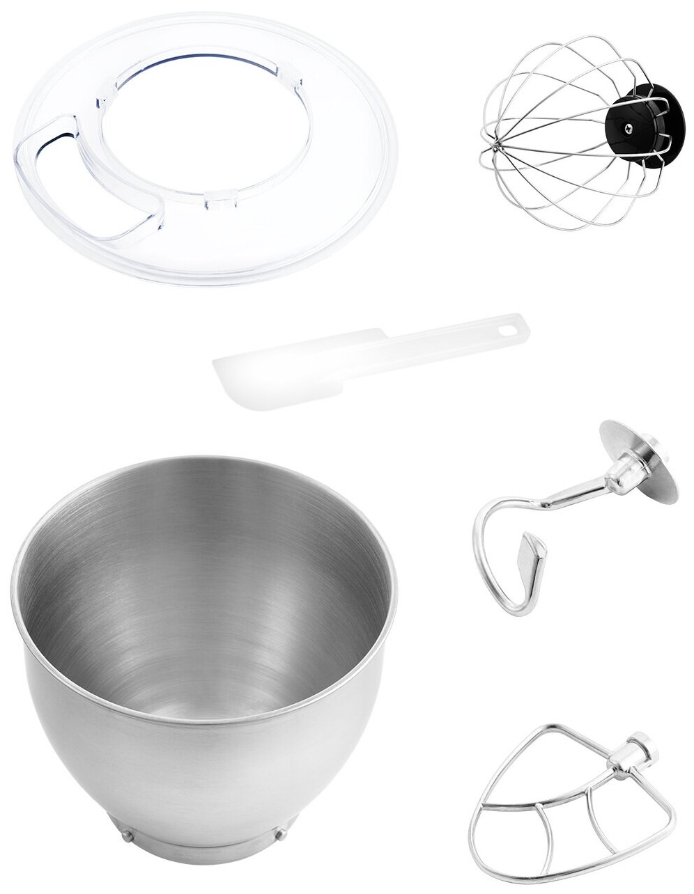 Type: planetary stationary, power: 1100 W, attachments: whisk for whipping, hooks for kneading dough, bowl material: stainless steel, bowl volume: 5 l, body material: plastic, additional modes: pulse �