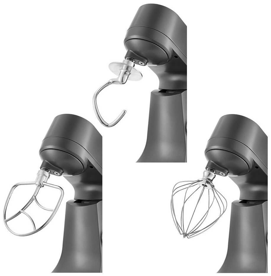 Type: stationary, power: 1000 W, attachments: whisk, dough hooks, spatula, bowl material: stainless steel, bowl volume: 5 l, body material: metal, additional modes: pulse mode