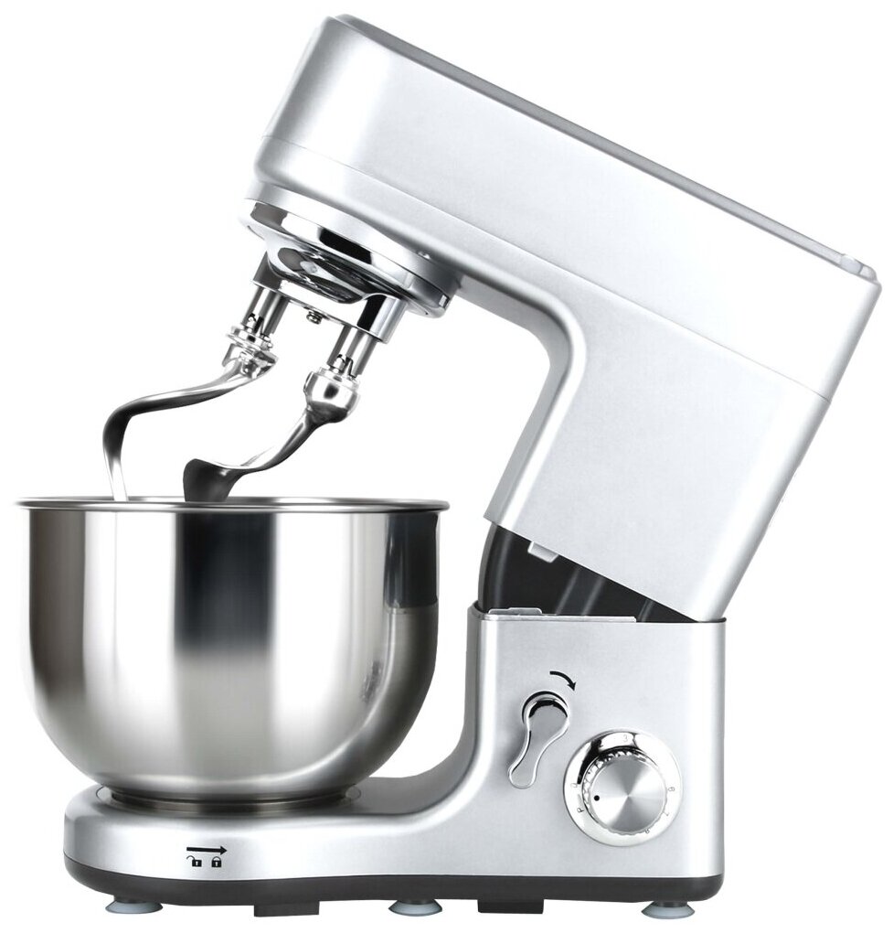 Type: stationary, power: 1200 W, attachments: whisk for whipping, hooks for kneading dough, bowl material: stainless steel, bowl volume: 5 l, body material: metal, additional modes: pulse mode, special