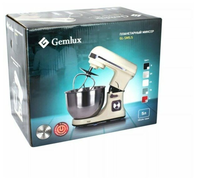 Type: planetary stationary, power: 1000 W, attachments: whisk for whipping, hooks for kneading dough, attachment for making puree, bowl material: stainless steel, body material: plastic, additional