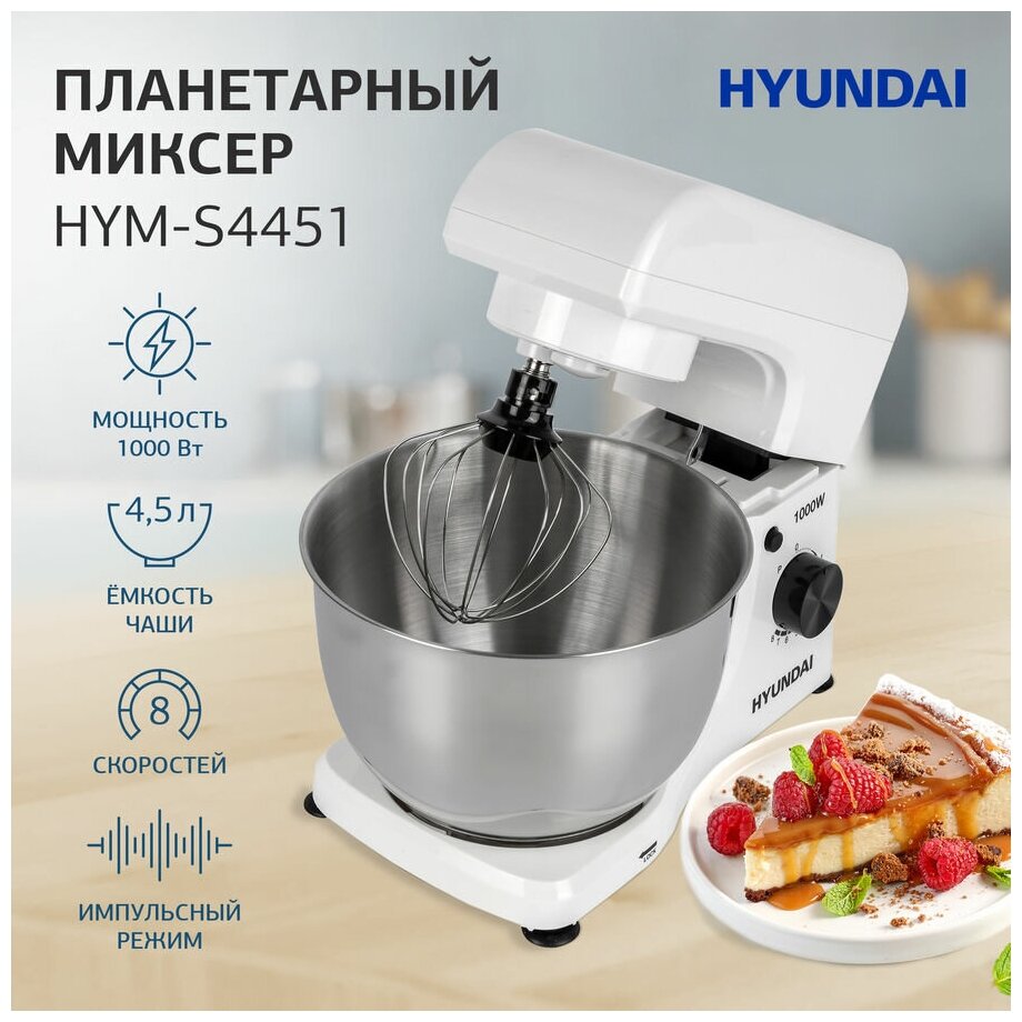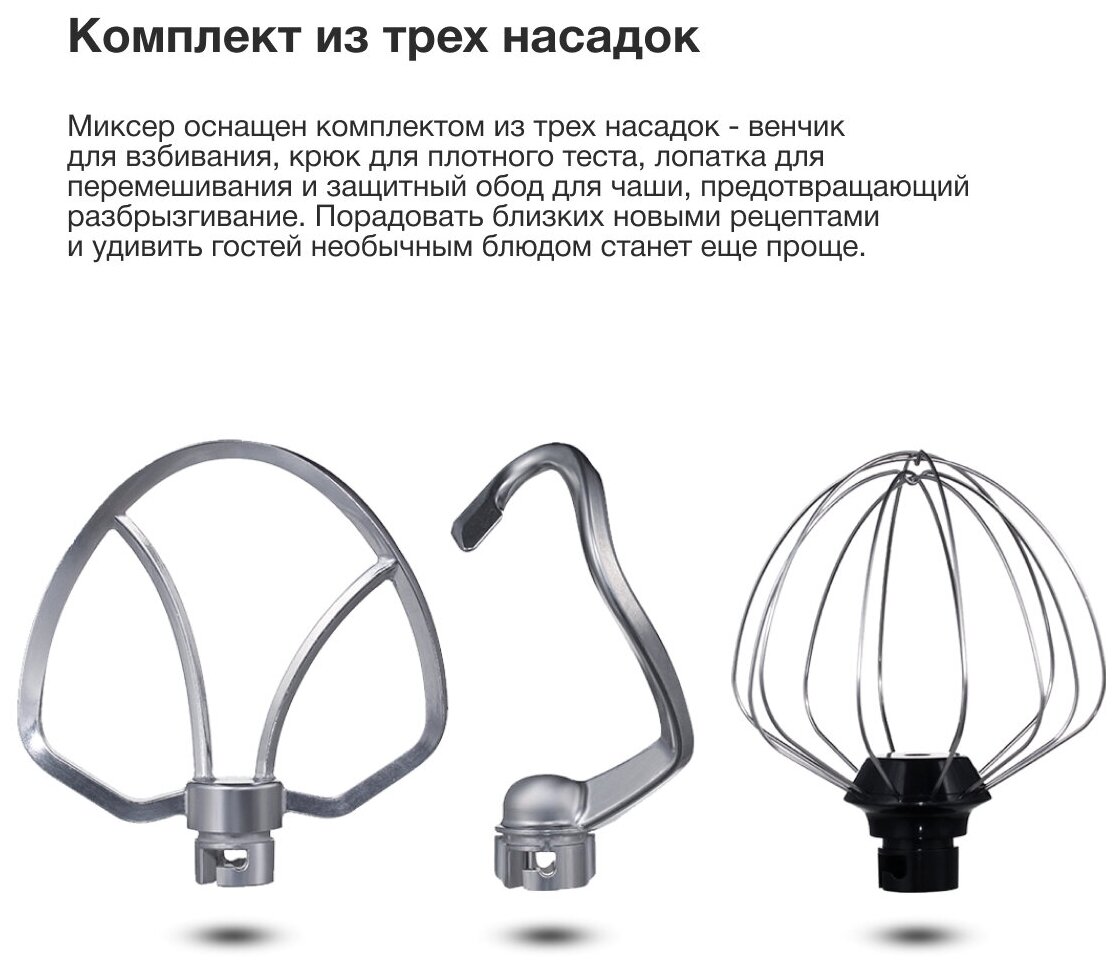 Type: planetary stationary, power: 1100 W, attachments: whisk for whipping, hooks for kneading dough, bowl material: stainless steel, bowl volume: 5 l, body material: plastic, additional modes: pulse �