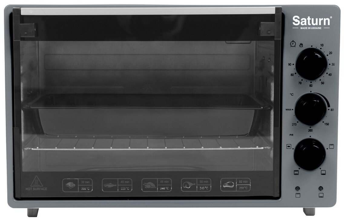 Contents: electric oven, grill grate 1 pc., baking sheet 1 pc., handle for the baking sheet 1 pc., instruction manual