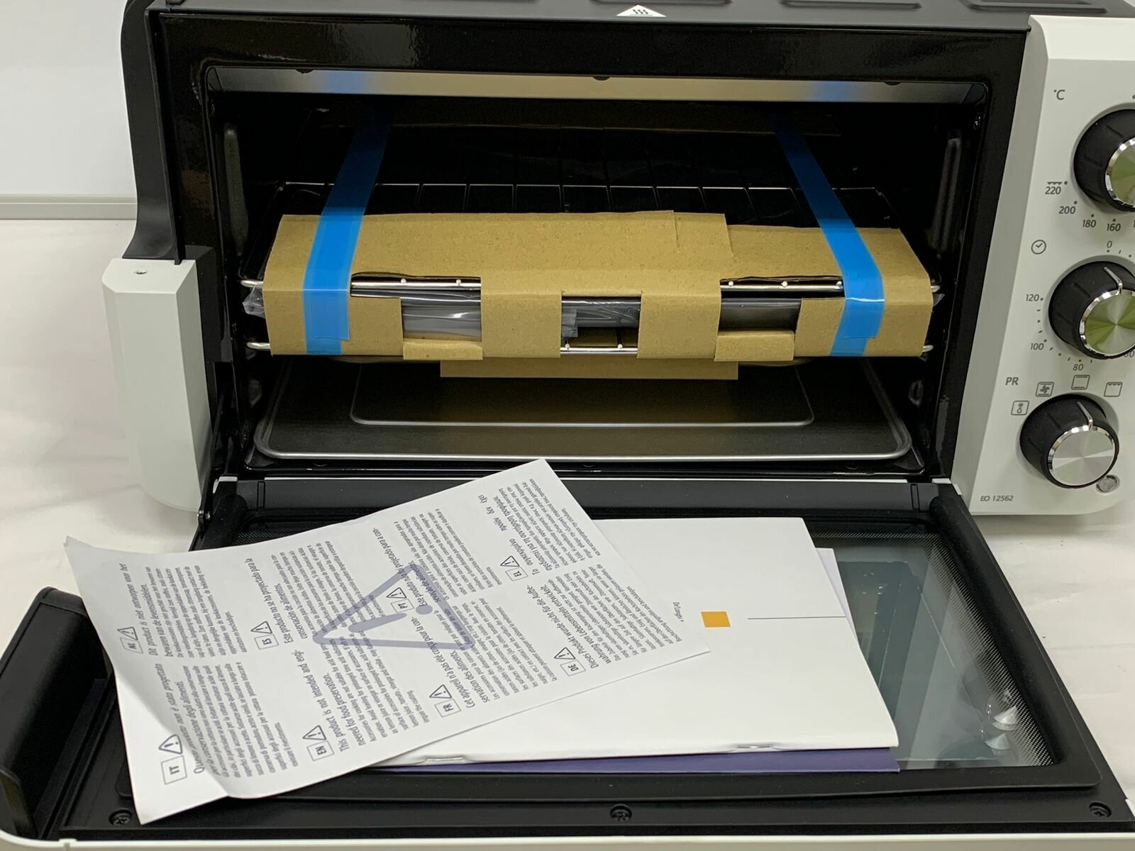 Contents: electric oven, grill grate 1 pc., baking sheet 1 pc., handle for the baking sheet 1 pc., instruction manual