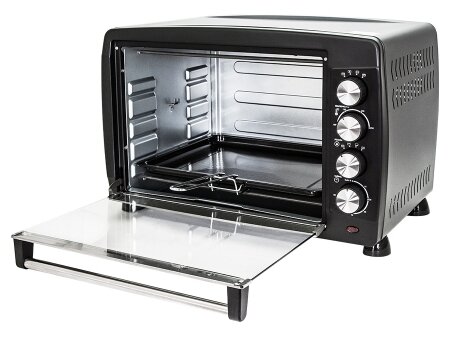 Description: Modes: top heating, top + bottom heating, bottom heating, chamber volume: 45 l, features: timer, control: mechanical, equipment: spit, holder for baking sheet/grid, tray for collecting crumbs, baking sheet, rack