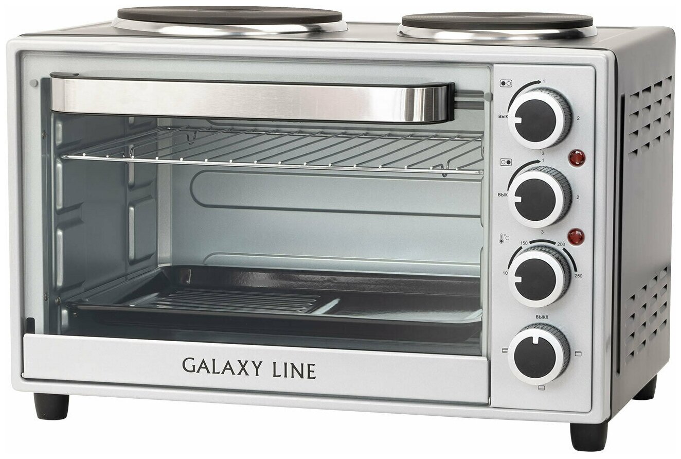 Contents: electric oven, grill grate 1 pc., baking sheet 1 pc., handle for the baking sheet 1 pc., instruction manual