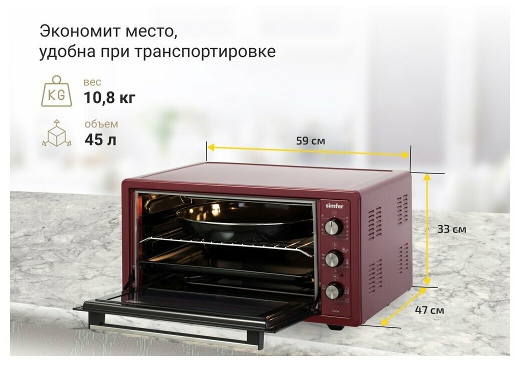 Contents: electric oven, grill grate 1 pc., baking sheet 1 pc., handle for the baking sheet 1 pc., instruction manual