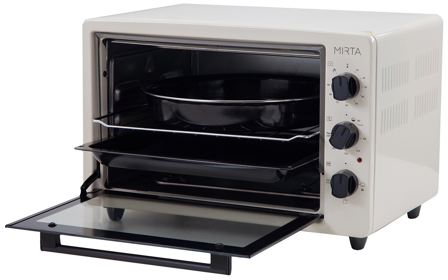 Modes: top heating, top+bottom heating, bottom heating, chamber volume: 38 l, features: timer, control: mechanical, equipment: round baking sheet, baking sheet, wire rack, width: 48 cm, depth: 33 cm, height: 32 cm , T
