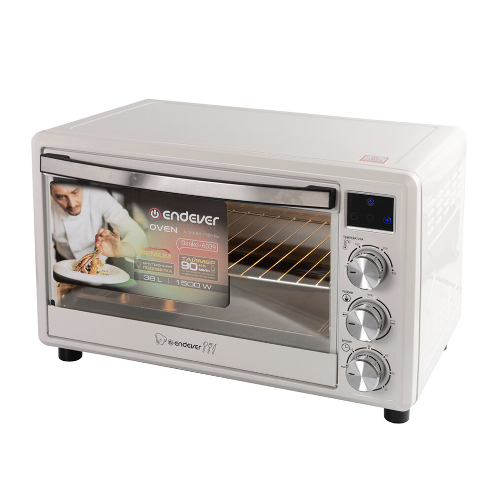 Modes: top heating, top+bottom heating, bottom heating, chamber volume: 38 l, features: internal lighting, display, timer, control: mechanical, equipment: holder for baking sheet/grid, baking sheet, sieve