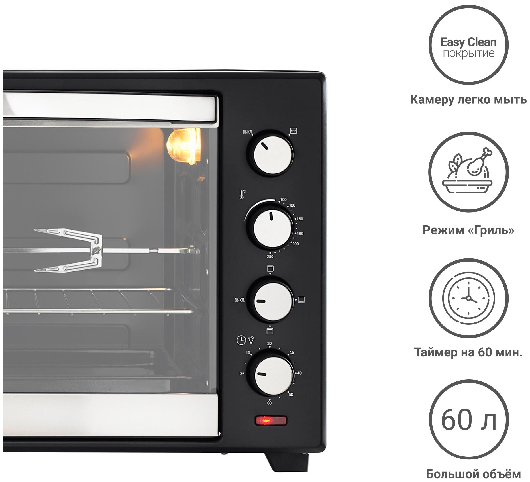 Contents: electric oven, grill grate 1 pc., baking sheet 1 pc., handle for the baking sheet 1 pc., instruction manual