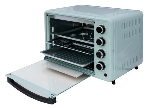 Modes: top heating, top+bottom heating, bottom heating, chamber volume: 32 l, features: timer, control: mechanical, equipment: holder for baking sheet/grid, tray for collecting crumbs, baking sheet, grid, tee
