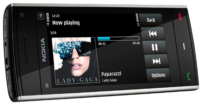 Nokia X6, Nokia BL-5J battery, Nokia AC-8 charger, CA-101 connection cable, WH-500 stereo headset, manual