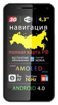 Screen diagonal: 4.30, number of main cameras: 1, memory: 4 GB, RAM: 0.5 GB, battery capacity: 1600 mAh, screen resolution: 800×480, memory card slot