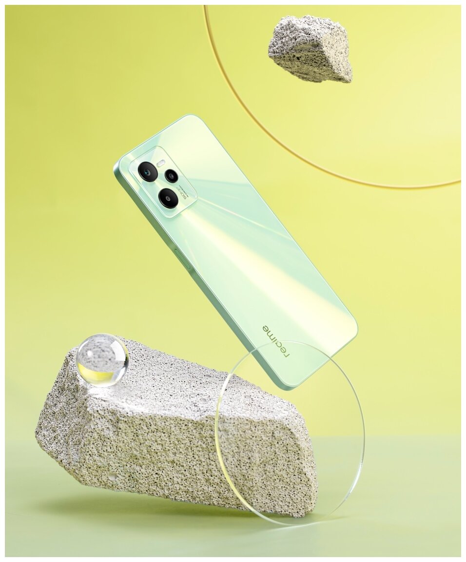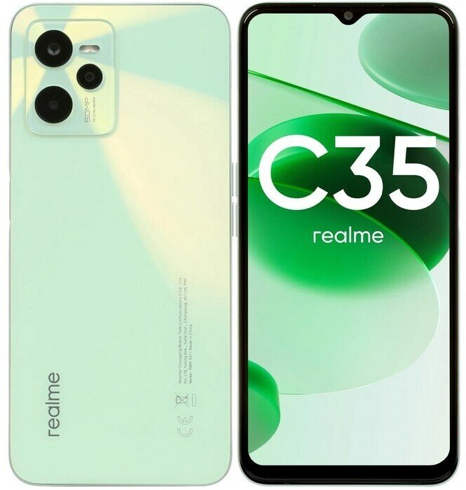 Realme C35 smartphone, USB Type-C cable, power adapter, SIM card removal tool, protective film, documentation